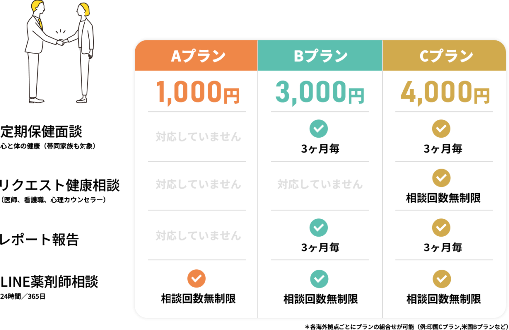 労働時間の確認を含む、3ヶ月ごとの定期的な心身の健康フォロー面談によって早期にリスク予測・ケアし、現地の時差に合わせた、日本人の医師・看護職・心理カウンセラー・薬剤師などの専門家とのチャットやオンライン面談を提供。海外赴任者を抱える企業様において、自社内のリソースでは難しい細やかなフォローを低コストで実現します。