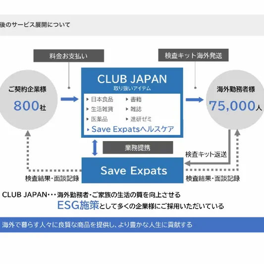 今回の業務提携により、SaveExpatsが提供する自己採血キット宅配によるリモート検査、母国医師とのオンライン相談サービス『SaveExpatsヘルスケア』を日販IPSの『CLUB JAPAN』を通じて提供することが可能となります。 現在、海外勤務者への健康ケアの中心として日本への一時帰国時の健康診断が実施されておりますが、赴任国に戻った後に検査結果が判明するケースも多く、再赴任後の本格的な医療ケアが困難となる場合における潜在的なリスクまではカバーする事ができておりませんでした。 『SaveExpatsヘルスケア』では日本基準の血液検査に加え、世界各地に在住の日本人保健師約300人のネットワークを活用し、各国の生活環境に合わせた保健指導により重症化リスクの抑制が可能です。 また、海外勤務者が日本への一時帰国前に『SaveExpatsヘルスケア』を利用、予め健康状態を把握しておくことで、日本帰国時により効果的な対応が可能となります。 今後、SaveExpatsおよび日販IPSの両社は、世界中で活躍する海外勤務者に対して、重症化する前の未病段階から積極的にアプローチすることにより、日本企業の健康経営のグローバル展開にも寄与してまいります。