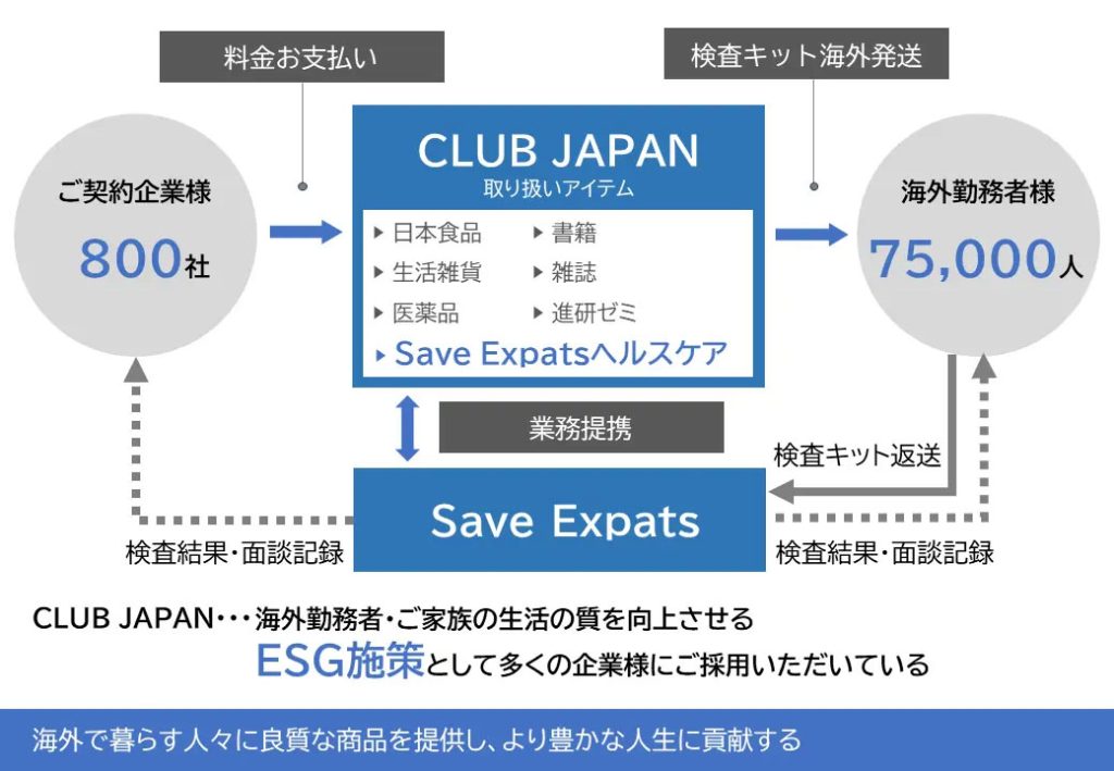 SaveExpatsは創業メンバー全員が海外駐在の経験者であり、仕事量の多さや時差対応による通院時間確保の難しさなど、海外勤務者の健康管理の難しさを痛感していました。その経験から、海外勤務者が世界中どこでも安心して働けるよう、現地と日本を結ぶオンライン医療相談と現地にいながら日本と同レベルの検査ができる国際郵送検査を組合せたサービス「SaveExpatsヘルスケア」を構築しました。 日販IPSは、サステナブルな社会・業界の実現のためESGを重視した経営を推進する日販グループホールディングスの海外事業会社として、約45年間にわたり、海外勤務者を派遣している日系企業に対して日本の書籍や食品、衛生用品をはじめとする物資送付サービスを提供し、厳しい環境で生活する海外勤務者及び帯同家族の心身の健康に貢献するため事業を展開しております。 昨今、健康経営の観点からも海外勤務者の健康に対して積極的に投資する必要性が高まっており、日販IPSは新たな価値提供の柱としてヘルスケアサービスの展開を検討しておりました。 そのような背景から、相互補完性の高いSaveExpatsのサービスと日販IPSの『CLUB JAPAN』が提携に至る運びとなりました。 加えて、政府の重要課題として健康経営優良法人2024における改定ポイントに「健康経営の国際展開-海外従業員」への対応が項目に挙げられました(※1)。SaveExpatsと日販IPSは本提携により、海外勤務者への積極的な健康支援に取組む企業を、健康経営の側面から支援してまいります。 ※1 令和5年7月18日 経済産業省主導の健康投資ワーキンググループにて、今年度の健康経営優良法人認定における改定ポイントに「健康経営の国際展開-海外従業員」への対応の項目が挙げられました。