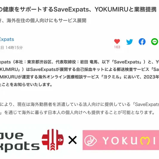 株式会社SaveExpats(本社:東京都渋谷区、代表取締役:岩田 竜馬、以下「SaveExpats」)と、YOKUMIRU株式会社(以下、「YOKUMIRU」)はSaveExpatsが展開する自己採血キットによる郵送検査サービス「SaveExpatsヘルスケア」及び、YOMIKURUが運営する海外オンライン医療相談サービス「ヨクミル」において、2023年8月13日に業務提携契約を締結したことをお知らせいたします。