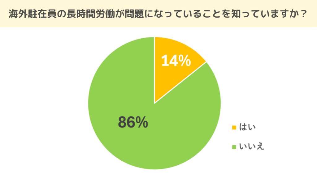 本調査では、「海外駐在員の長時間労働が社会課題として取り上げられていることを知っているか」を問いかけたところ、「知っている」と回答したのはわずか14%にとどまりました。